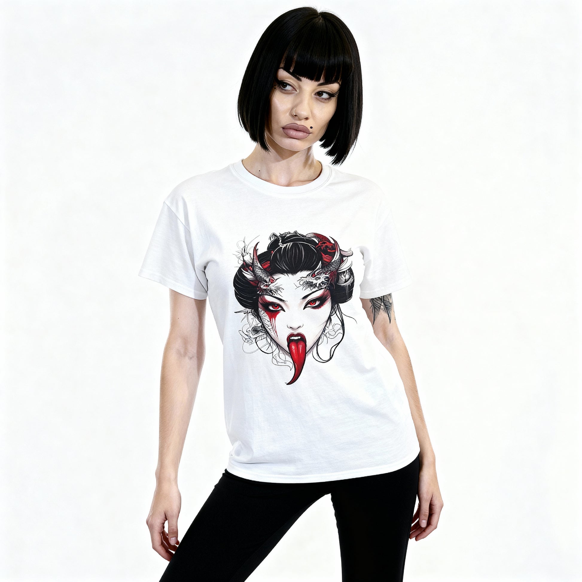 The Geisha Face Graphic Tee merges traditional artistry with modern streetwear. Crafted from ultra cotton, this tee offers both comfort and a bold statement.