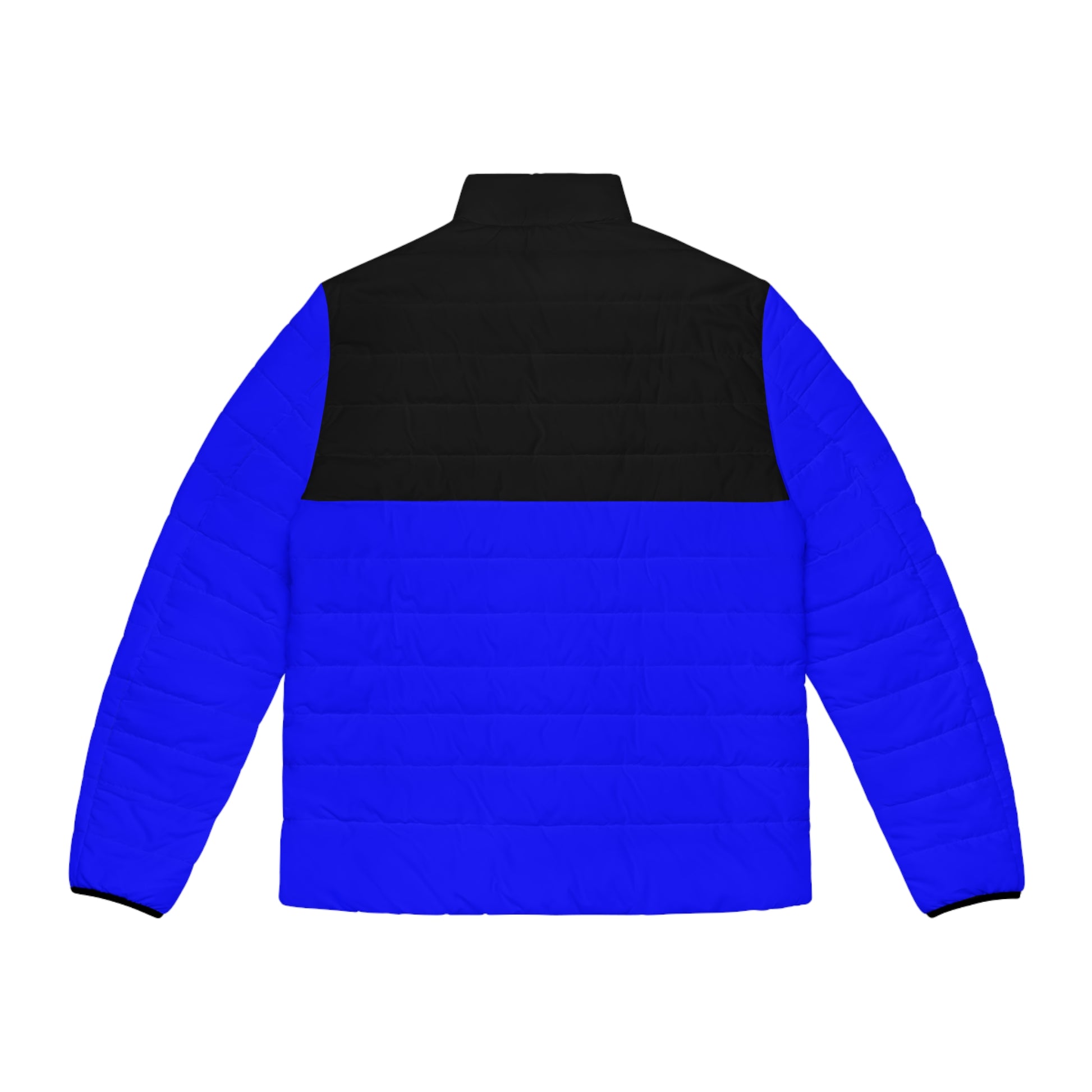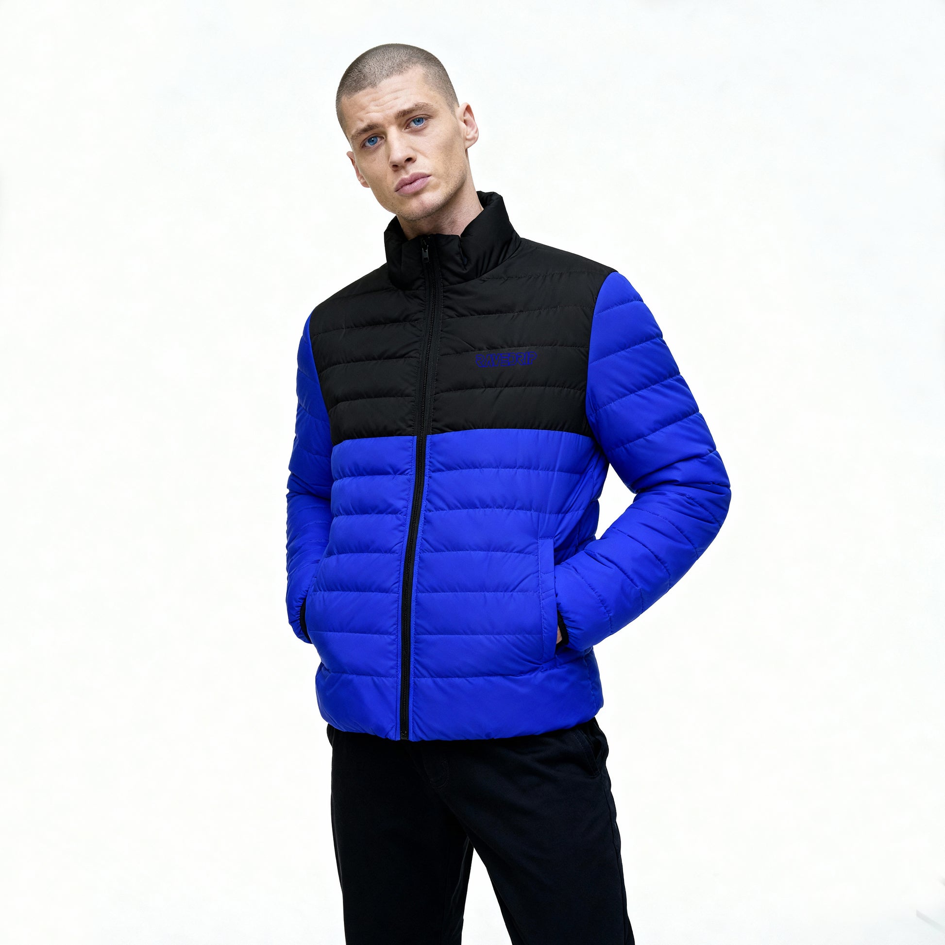 Turn heads with the Rave Drip Royal Blue Colorblock Puffer Jacket for Men — a bold statement piece that merges warmth, comfort, and street-ready style.